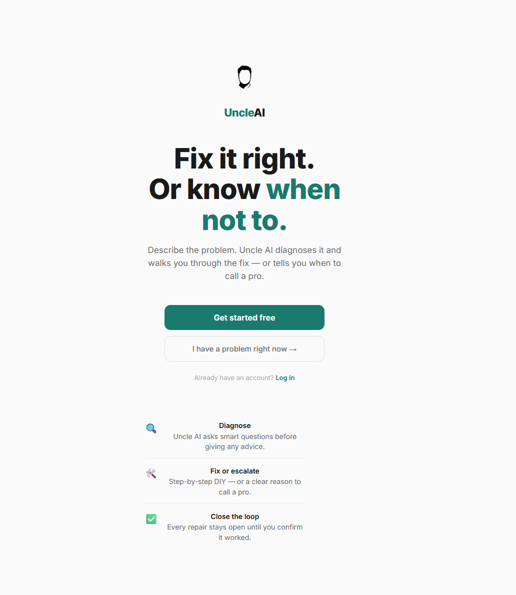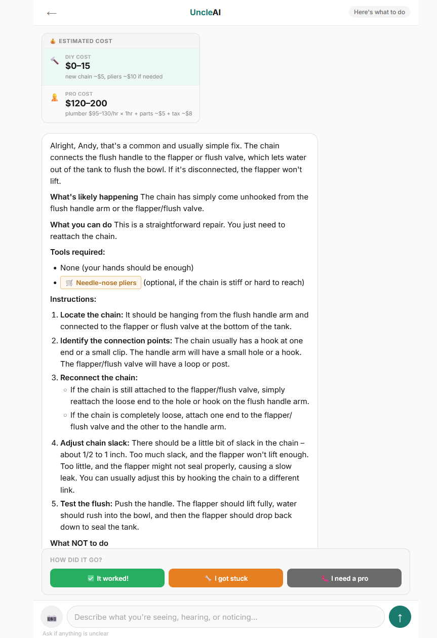 Uncle AI is an AI-powered home repair and maintenance assistant built for everyday homeowners. Instead of wading through YouTube videos or waiting days for a contractor callback, homeowners describe their problem in plain language - and Uncle AI asks the right diagnostic questions, explains what's broken, provides step-by-step repair guidance, and tells them honestly when they need to call a professional.